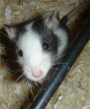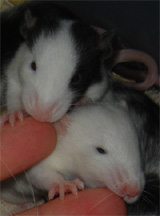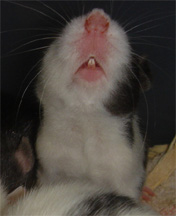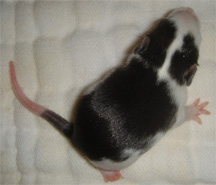 Name: Crescendo - A gradual increase, especially in the volume or intensity of sound in a passage; named because of the black markings on her face that eventually go over her entire back. Date of Birth: March 28, 2005 Gender: Female Colors and Markings: Collared, Mismarked Possum From:: Rescue from Illinois - Fostered by me Comments: Crescendo has a strange birth defect on her back left foot - two of her toes are fused together, have no nail, and are much shorter than they should be. She can walk and run around just like the other babies, though. Crescendo is one of the cuties in the group. She's constantly making faces at you when you open the cage and really loves to be held and cuddled - basically being babied.